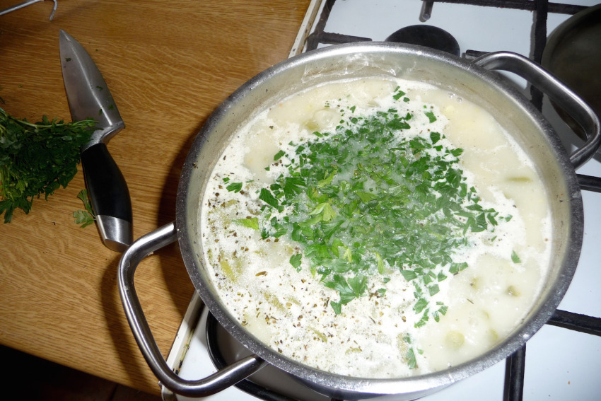 Wyłącz gaz i na koniec wrzuć do zupy garść posiekanej natki pietruszki.