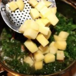 Do wywaru wrzuć starte warzywa, posiekany jarmuż oraz ziemniaki.