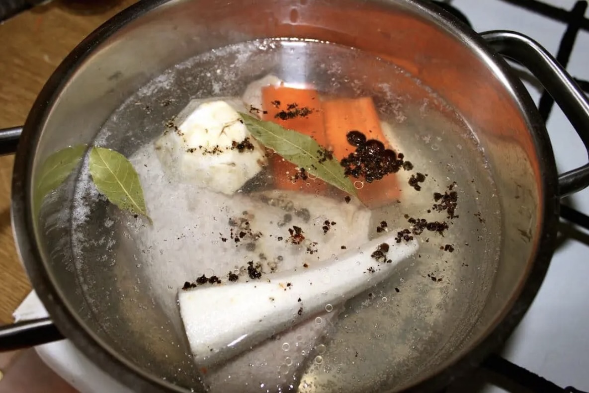 Dodaj kawałek marchewki, selera i pietruszki oraz przyprawy (liść laurowy, ziele angielskie, pieprz, łyżeczka soli).