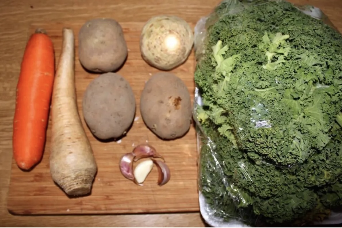 Warzywa: 300 g świeżego jarmużu, 2-3 ziemniaki, 1 dodatkowa marchewka, 1 pietruszka, kawałek selera, 2 ząbki czosnku.