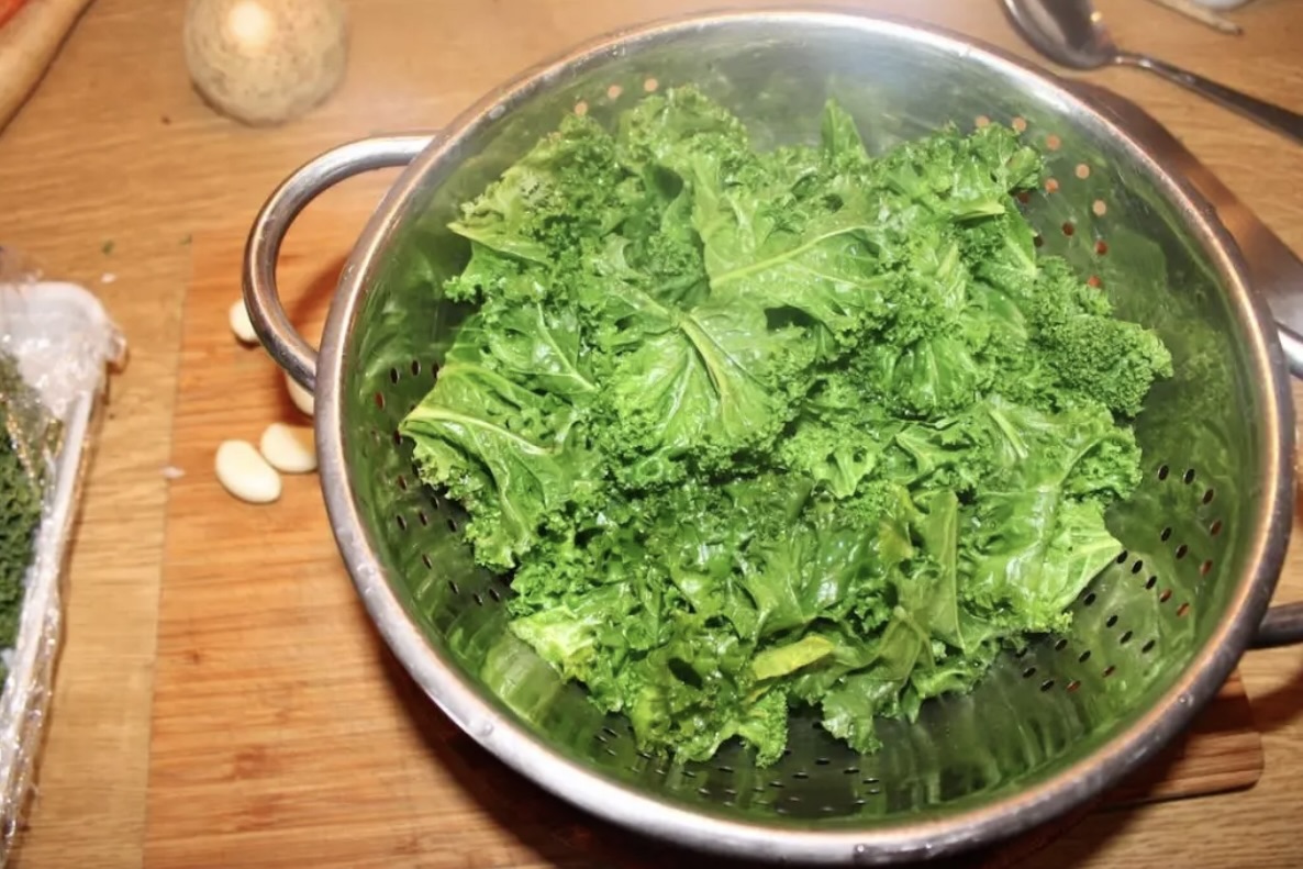 Z jarmużu usuń twarde, grube łodygi, zostawiając same liście. Przelej je wrzątkiem i drobno posiekaj.