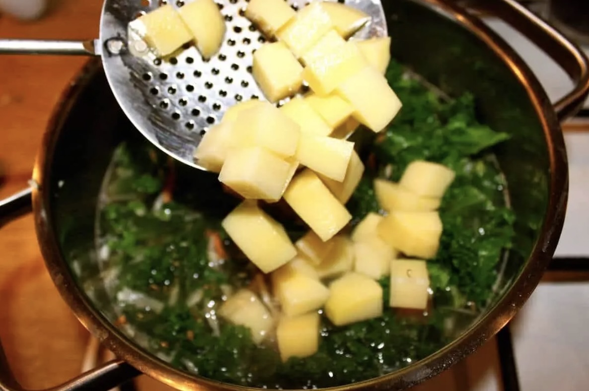 Do wywaru wrzuć starte warzywa, posiekany jarmuż oraz ziemniaki.