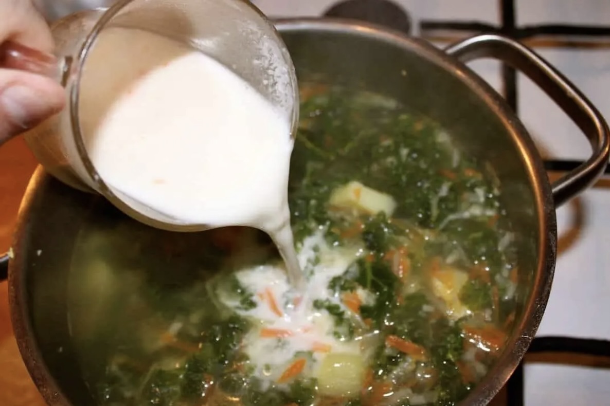 W kubku wymieszaj mąkę z odrobiną wody i śmietaną. Zahartuj mieszankę, dodając kilka łyżek gorącej zupy, a następnie wlej całość do garnka.