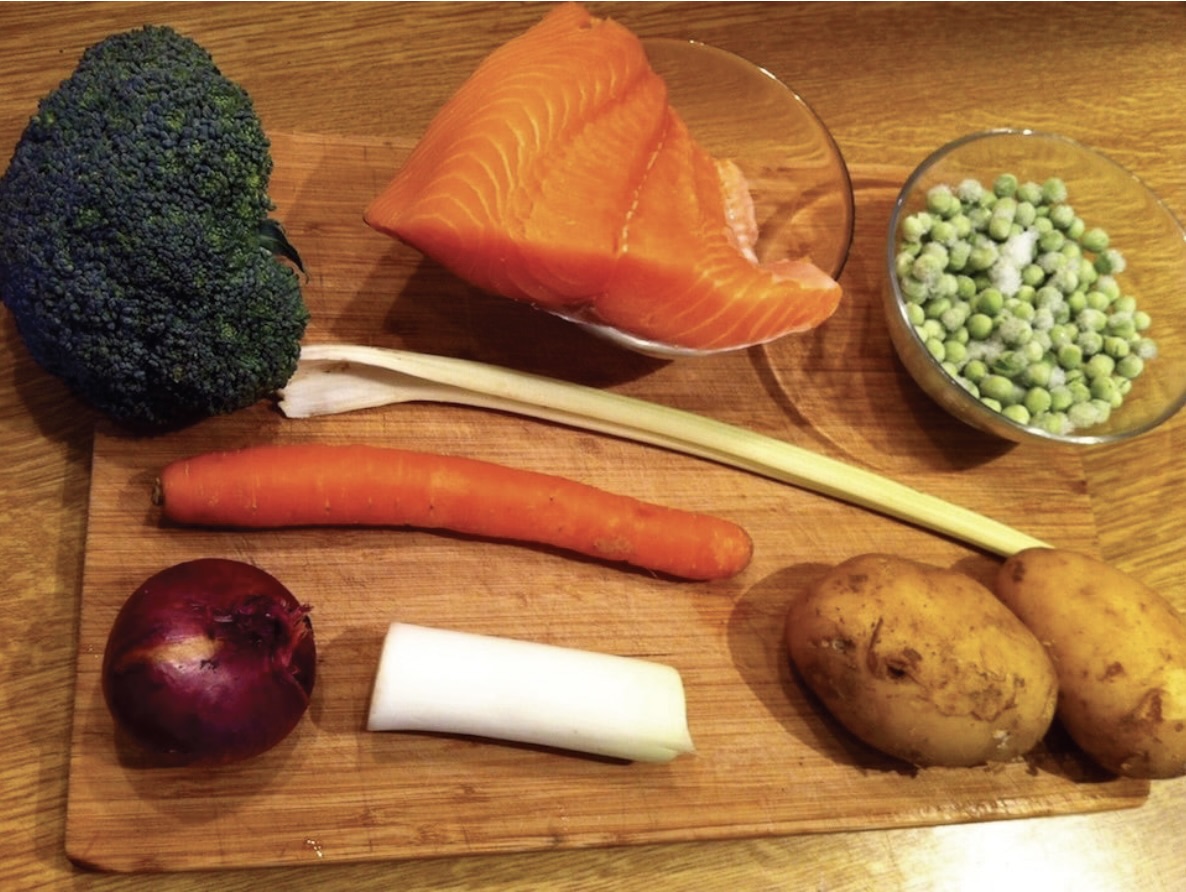 Warzywa: 2 ziemniaki, 1 marchewka, 1 czerwona cebula, kawałek pora, 1 łodyga selera naciowego, połowa brokuła, 2 garście groszku (może być mrożony).