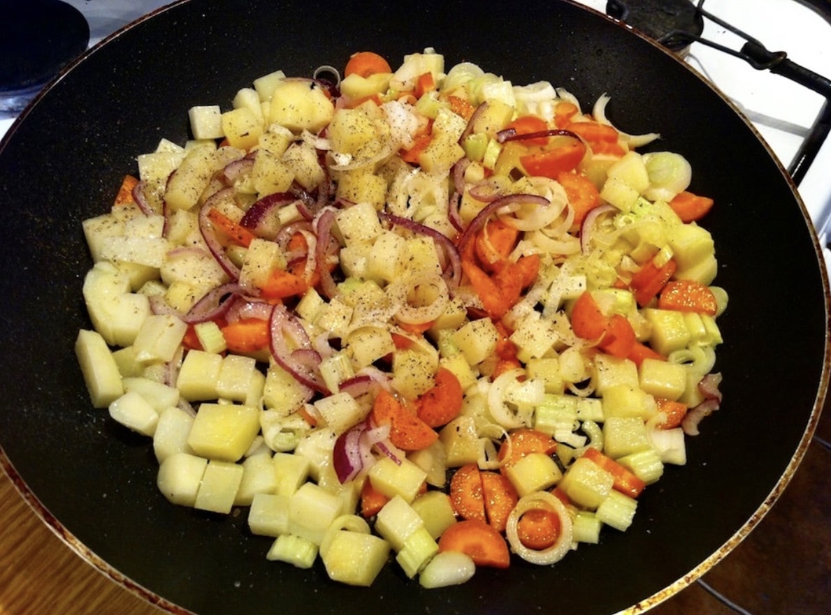 Podsmażanie: Na patelni rozgrzej olej, a następnie wrzuć pokrojone warzywa (ziemniaki, marchew, cebulę, pora, selera). Dopraw solą i pieprzem, a następnie duś na wolnym ogniu przez ok. 5–7 minut, aż lekko zmiękną.