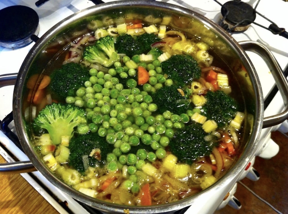 Gotowanie bazy: W garnku zagotuj bulion. Dodaj do niego podsmażone warzywa z patelni oraz różyczki brokuła i groszek. Gotuj całość na średnim ogniu przez około 5 minut.