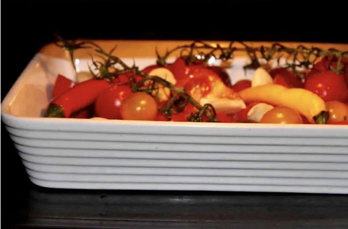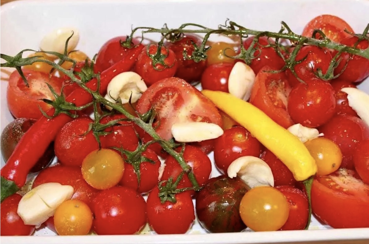 W naczyniu żaroodpornym umieść pomidory (całe), 2 gałązki pomidorowe, papryczki chilli oraz ząbki czosnku.
