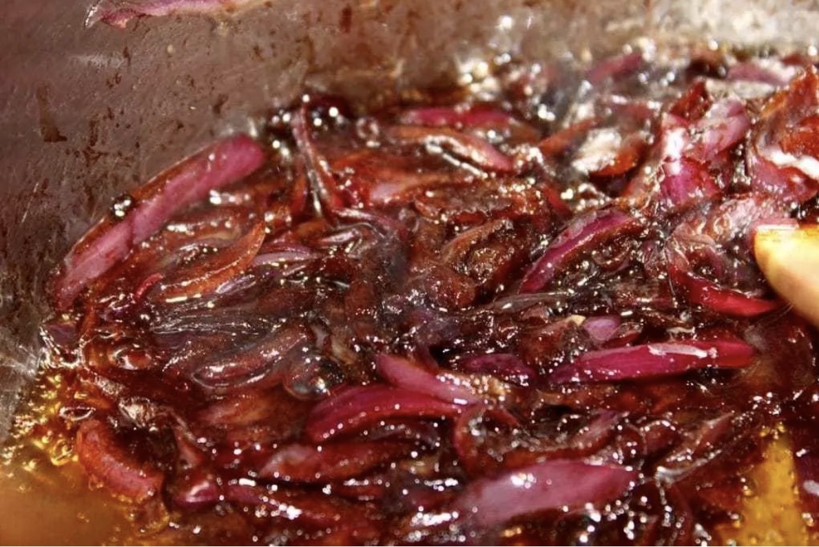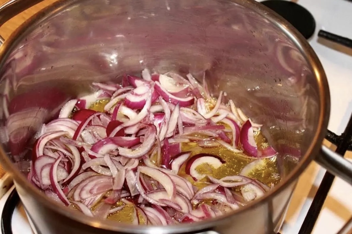 W garnku rozgrzej oliwę, a następnie wrzuć pokrojoną w piórka czerwoną cebulę. Smaż do zeszklenia.