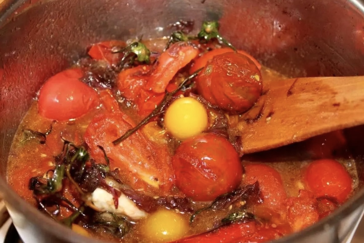 Upieczone pomidory przełóż do garnka z cebulą (pamiętaj o usunięciu twardych gałązek, chyba że chcesz je zmiksować dla aromatu – autor wspomina, że czasem to robi, ale standardowo warto je wyjąć).