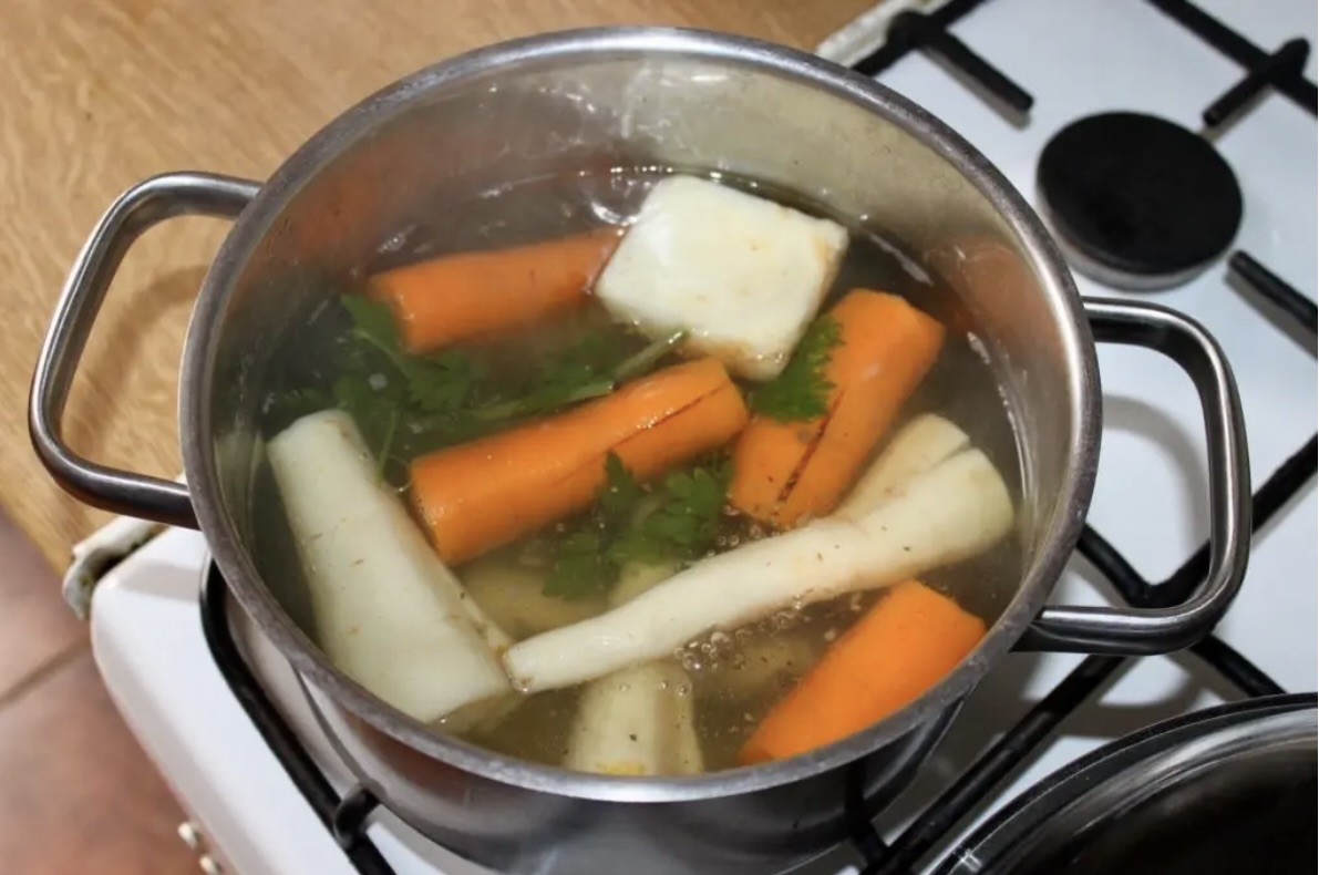 Wywar: Z marchewki, pietruszki, selera i części natki ugotuj około 1,5 litra wywaru jarzynowego (możesz użyć gotowego, domowego bulionu).