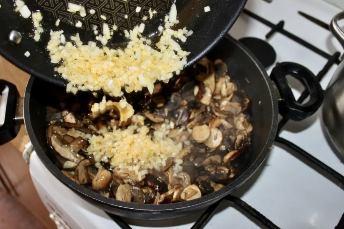 Na mniejszej patelni osobno zeszklij cebulę na maśle, a następnie dodaj ją do grzybów.