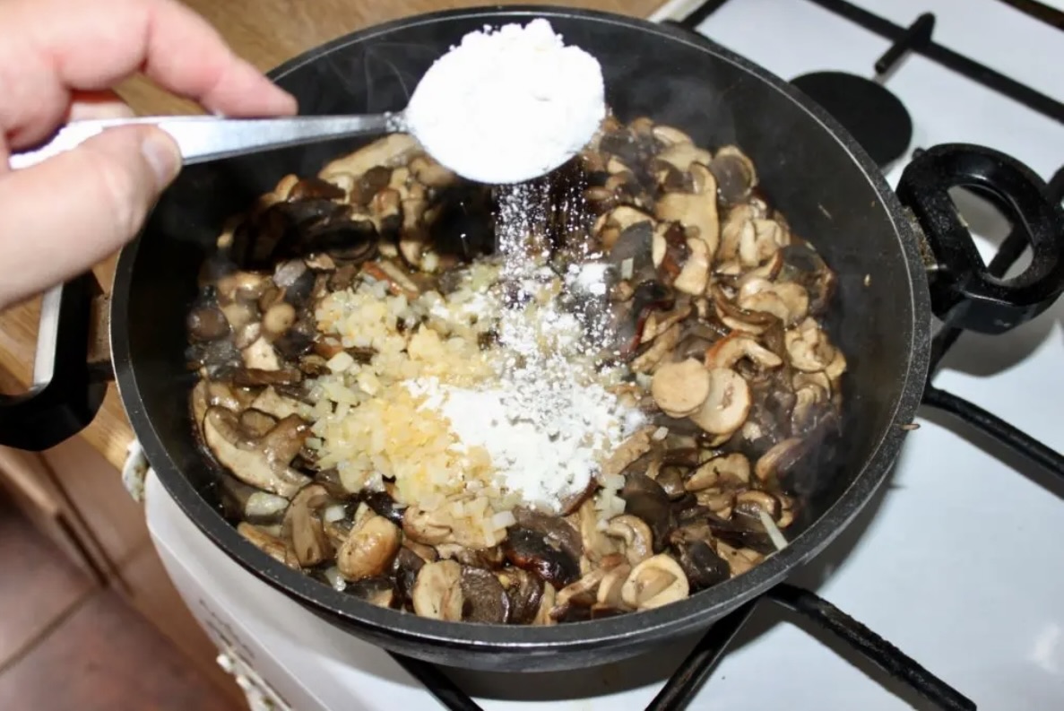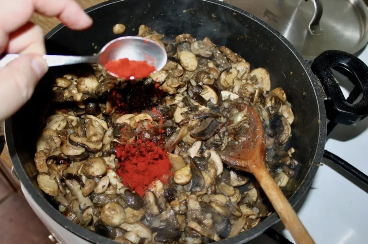 Zagęszczanie na patelni: Do grzybów z cebulą wsyp łyżkę mąki, wymieszaj, a następnie smaż minutę. Dodaj słodką paprykę oraz tymianek. Wlej szklankę gorącej wody, aby powstała gęsta masa.