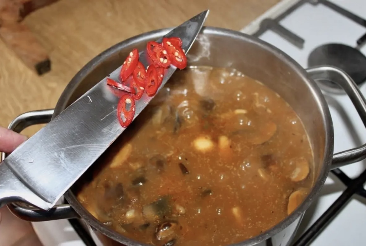 Makaron i chilli: Do zupy dodaj makaron orzo oraz posiekaną w plasterki papryczkę chilli. Gotuj do miękkości makaronu (ok. 5 minut).