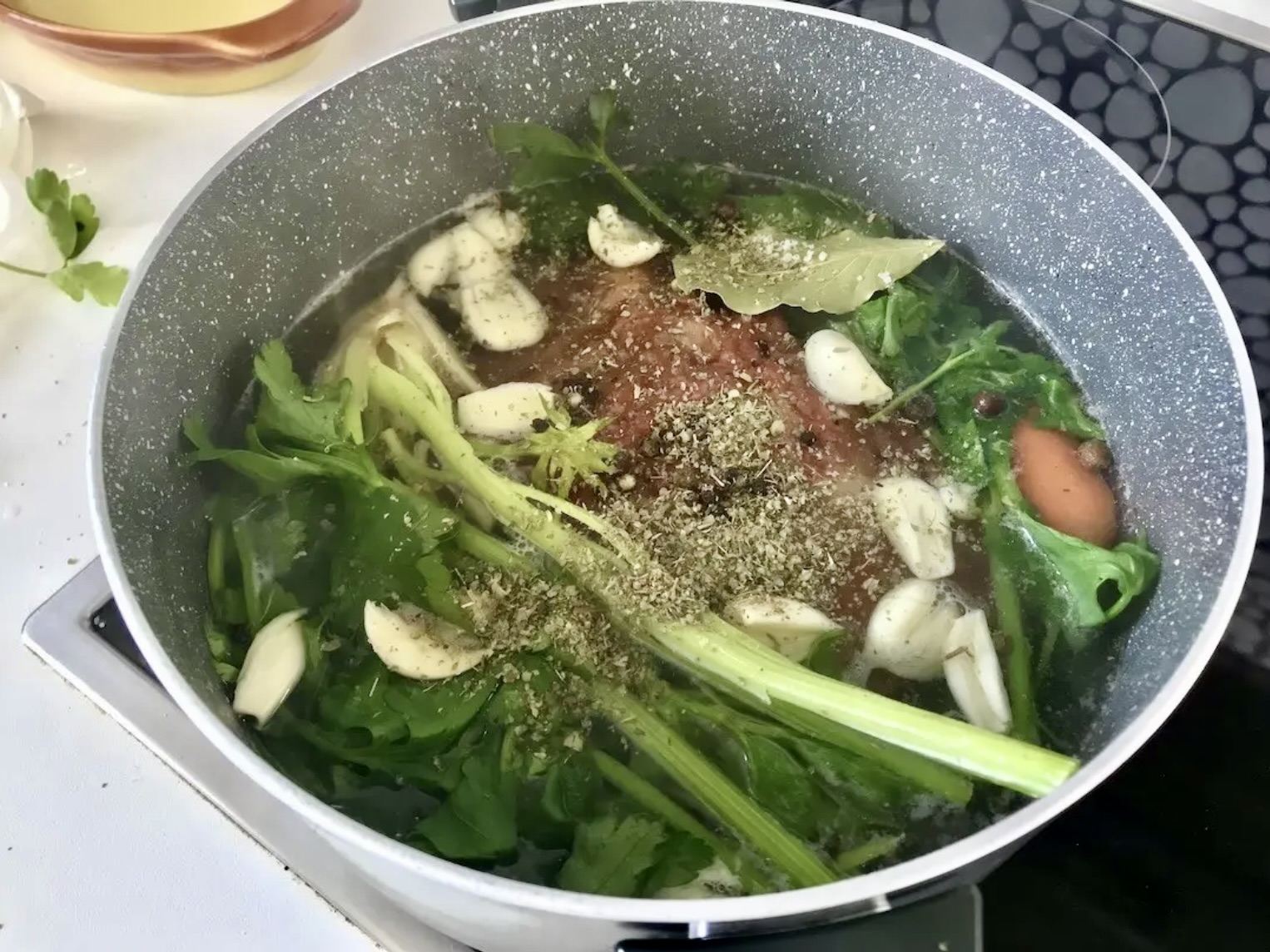 Dodaj seler, marchewkę, pietruszkę, liście laurowe, ziele angielskie, sól i pieprz ziarnisty.