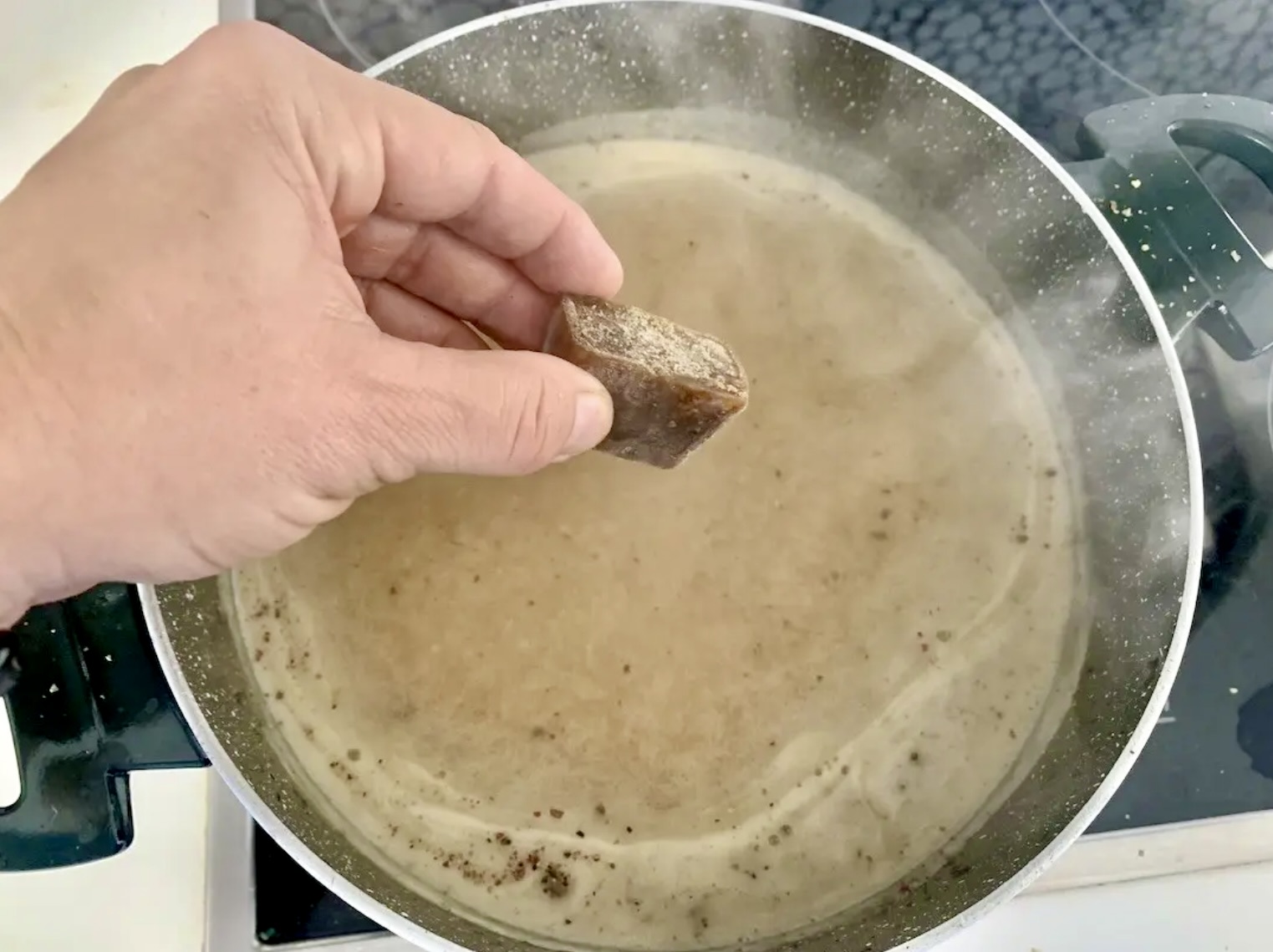 Dodaj namoczone i ugotowane suszone grzyby. (Możesz użyć też mrożonych kostek grzybowych – zobacz przepis na domowe kostki grzybowe).